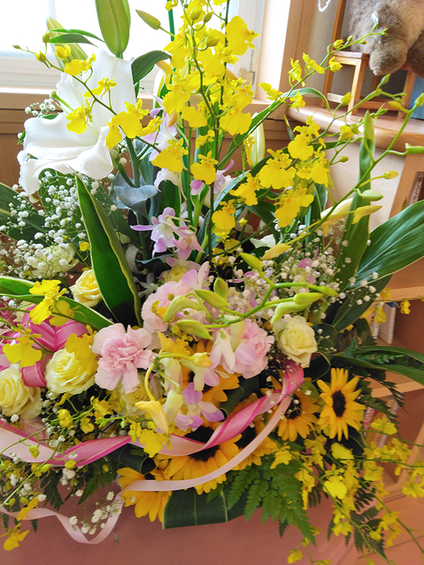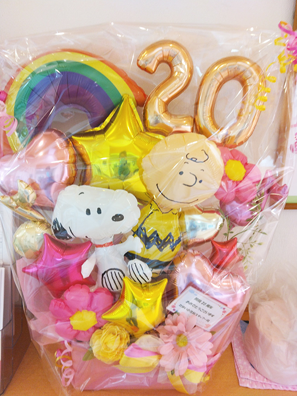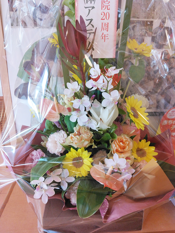 画像は、20周年を迎え、皆様からいただいたお祝いのお花とバルーンアートです。